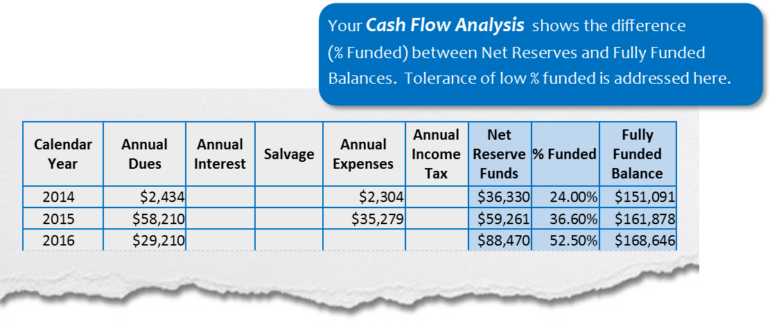 In this report, the reserve item payments and expenses may be summarized by calendar year or expense year. The report is typically one page long, but may consist of two or three pages if the Study Life is over 30 years. The Cash Flow analysis is tabulated by Year, Revenue, Interest, Salvage, Expense, Tax burden, and the projected net reserve balance at the end of the year.