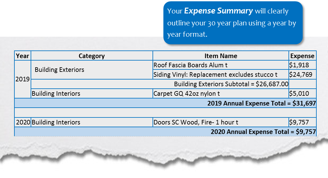 In this report, the annual expense are tabulated by year, reserve category, and reserve item name.  The report is typically one or more pages long, and is limited to a 30-year tabulation. See Expense Summary. The best method of printing the Expense report, requires the use to ‘’Tabloid’’ paper (11×17) and a wide format printer.  Attempts at using letter-sized paper and legal sized paper have produced reports that are difficult to read or confusing. If you don’t have a wide format printer, then use the PDF method to print the report.