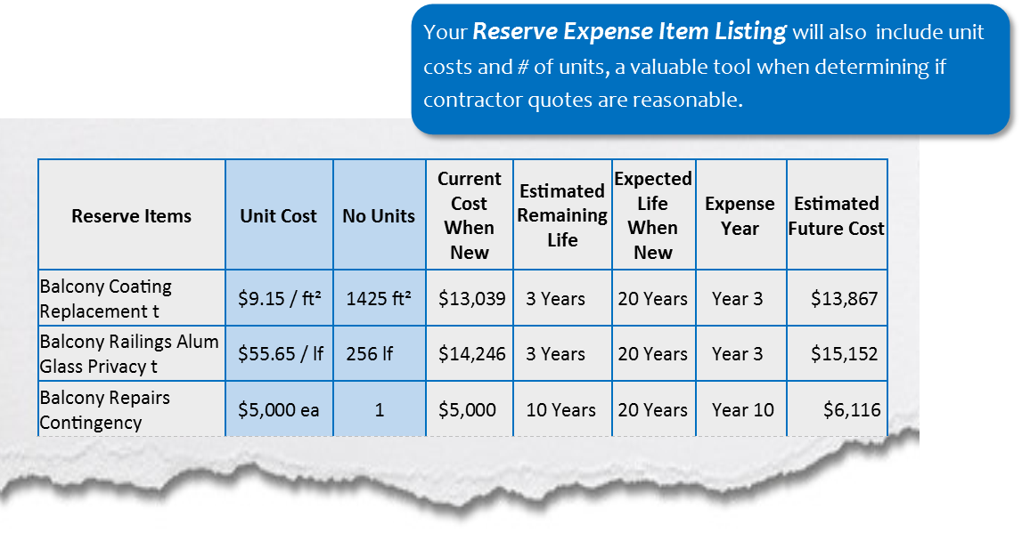 In this report, the reserve items are assembled by category and every repetition of repeating reserve items is shown (referring to Reserve Item Summary).  The report often consists of 5 to 20 pages of listings.  At the end of the report, you will find a list of abbreviations. Reserve items are listed by Category, Item Name, Unit Cost, Number of Units, Cost When New, Remaining Life, Expense Year, Future Cost, and the Raw Annual Payment.