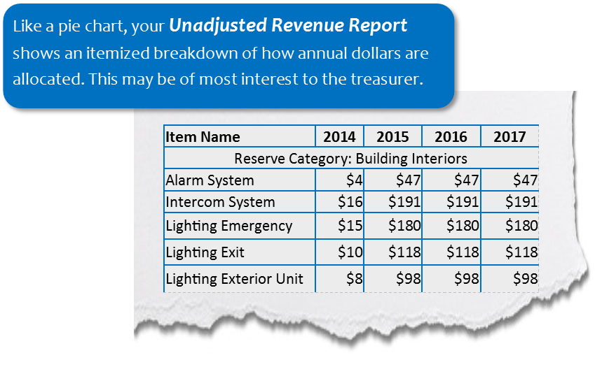 In this report, the reserve items are assembled by category with optional subtotals by category. Reserve items are shown with the number of units, the unit cost, and the present cost.  The report often consists of 5 to 20 pages of listings.